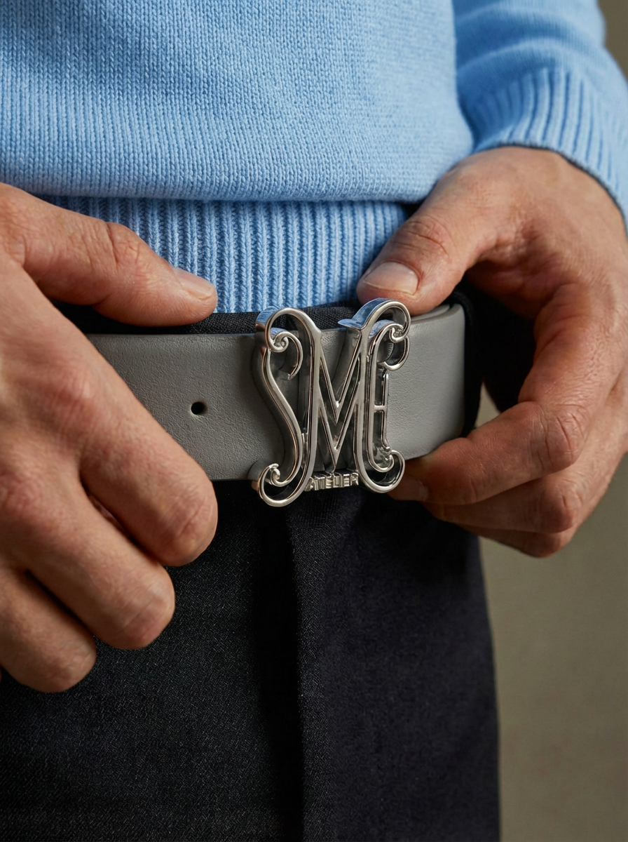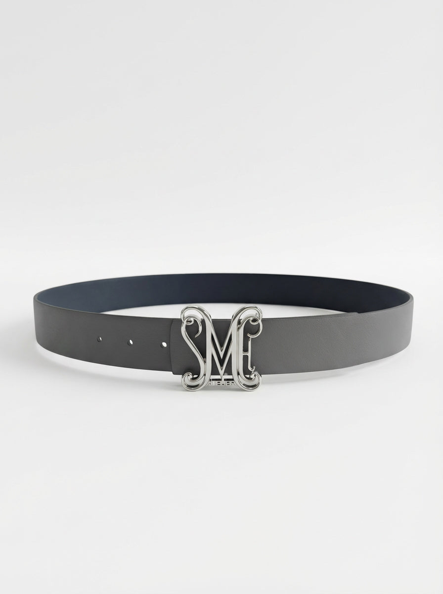 At the center is the exclusive SMH Atelier logo buckle in Platinum—a sculpted statement of craftsmanship and quiet sophistication. Minimal, modern, and unmistakably distinguished.